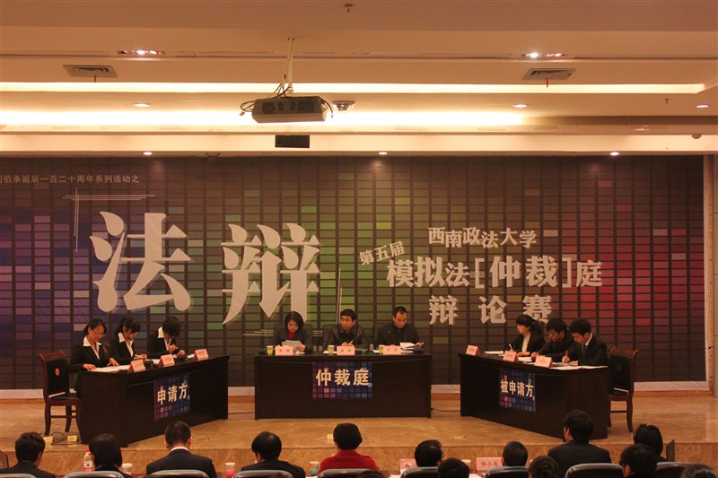 12月8日下午两点半,第五届西南政法大学模拟法庭仲裁辩论赛半决赛于图书馆学术报告厅拉开帷幕。我院代表队作为被申请方对阵申请方法学实验班“一裁到底队”。本场仲裁辩论赛由经济法学院肖晖副教授担任首席仲裁员,红岩律师事务所副主任胥娟老师与重庆志同律师事务所付伟老师担任仲裁员。