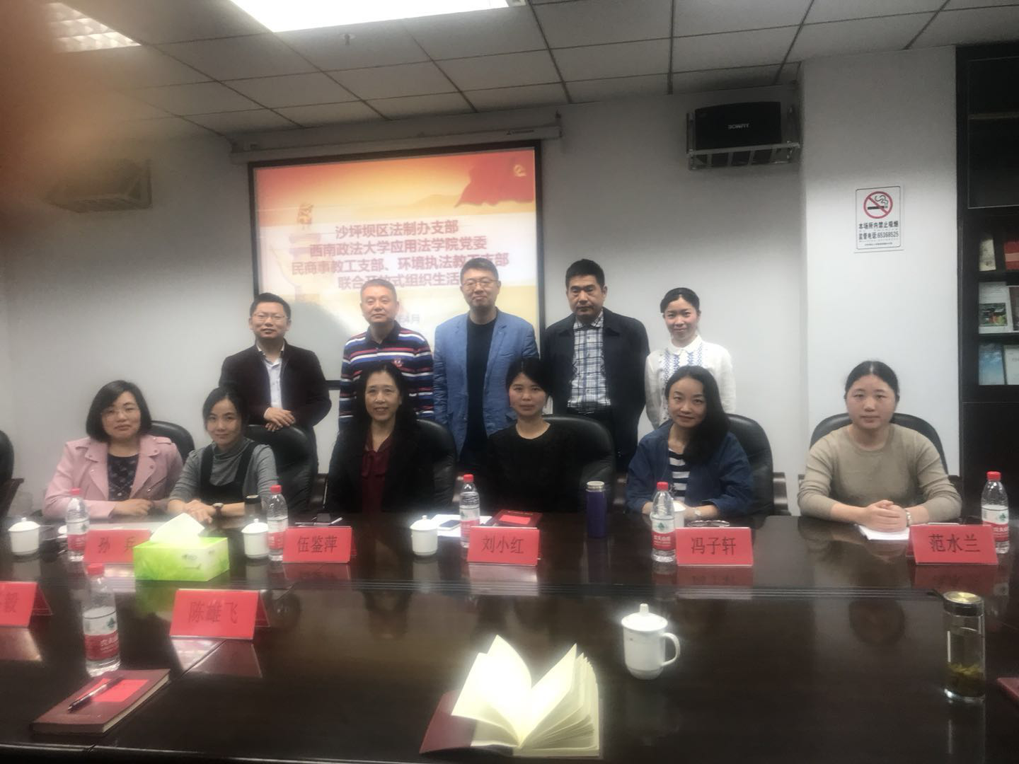 为了深入贯彻落实习近平总书记关于大兴调查研究之风的重要指示精神,积极落实市委扎实推进兴调研转作风促落实行动,按照学校党委的要求,应用法学院党委认真组织开展大兴调研转作风促落实行动。2018年4月17日,应用法学院党委民商事法律适用教研室教工党支部与环境执法教研室教工党支部赴沙坪坝区政府法制办公室支部调研,开展了一场别开生面的校地联合开放式组织生活。