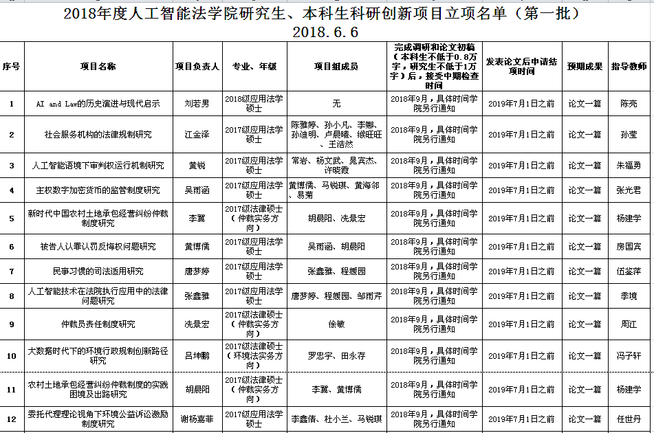 2018年度人工智能法学院研究生、本科生科研创新项目立项(培育)名单(第一批)2018.6.6