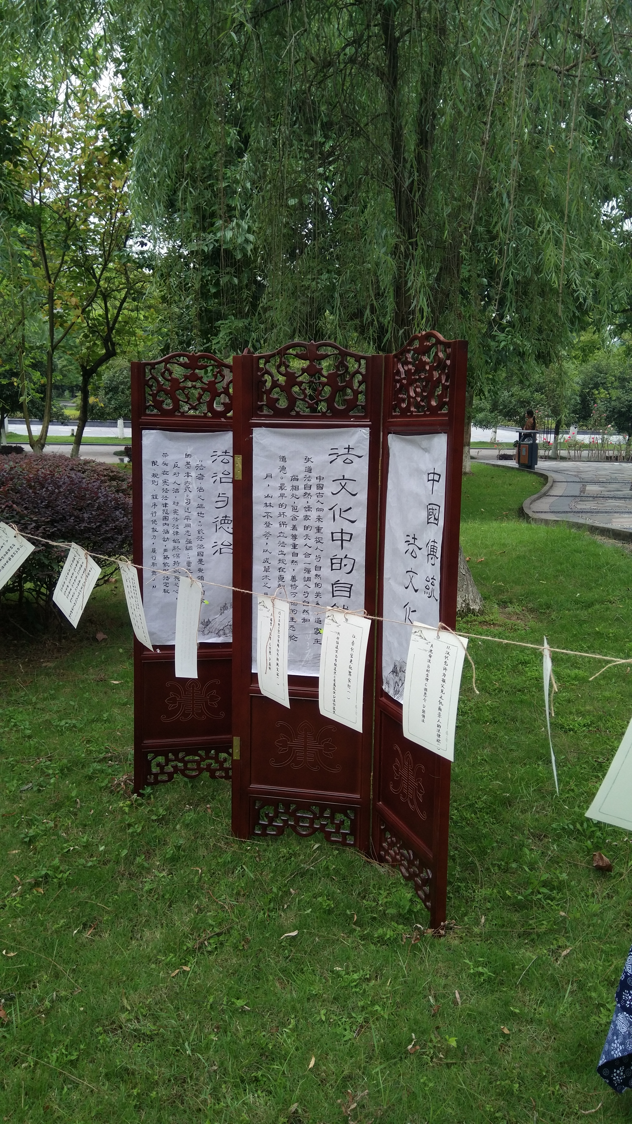 在现场两端的屏风上,隽写着中国传统法文化相关的知识,古色古香,气韵优雅。黄薇老师借由端午活动来增强同学们对中国传统法文化的重视,让同学们从中汲取养分,滋养中国特色社会主义法治。本次活动现场还展出了许多有关传统法文化的经典书籍供同学们翻阅。书籍由学院法制史老师郑军等推荐,不仅有龙大轩老师的著作,还有秦涛老师的《老谋子司马懿》、《黑白曹操》等。整个活动现场古色古香,充满诗意。