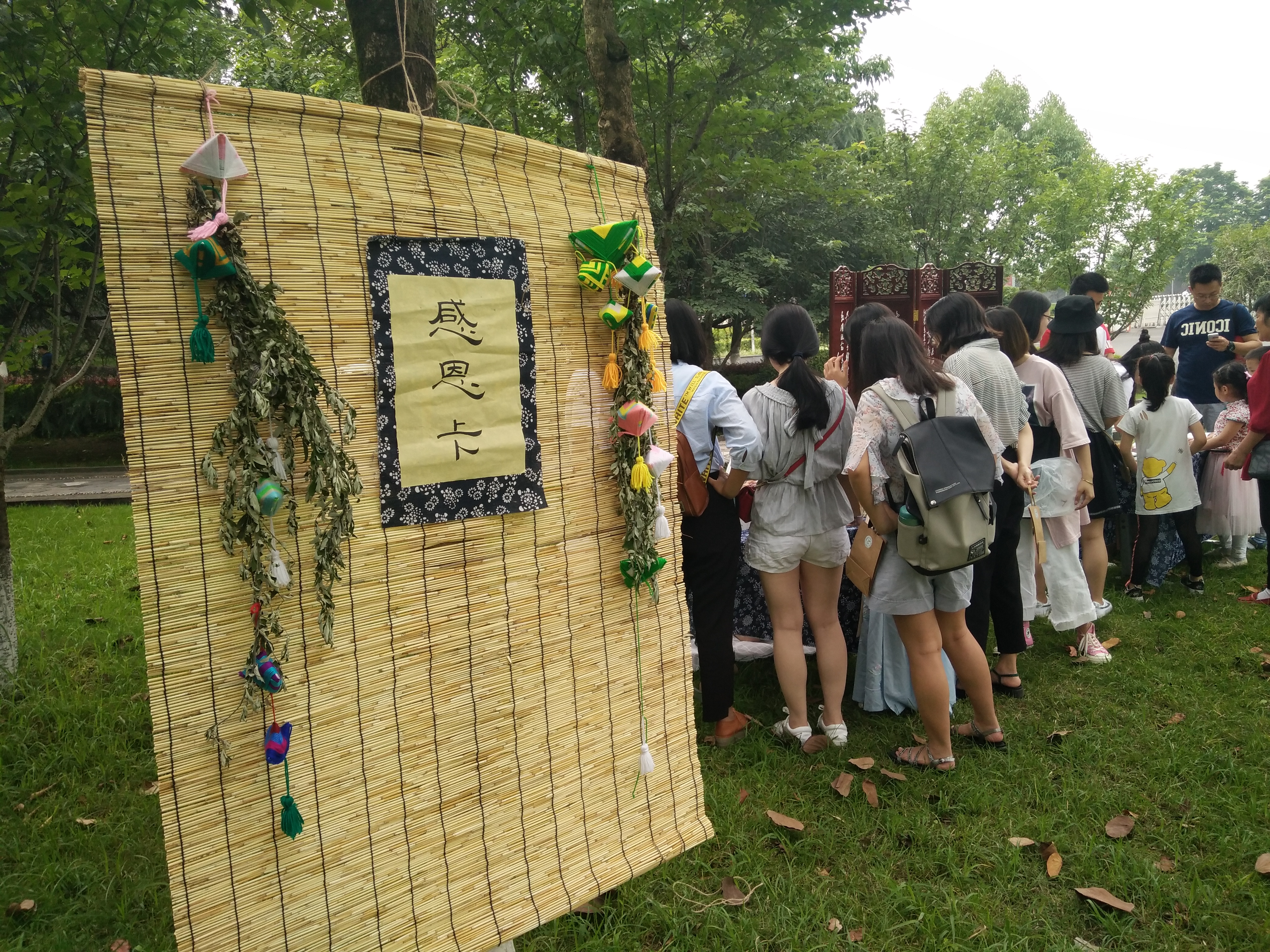 从箬叶到糯米,从馅料到造型,同学们精心包裹着不同花色品种的粽子,煮出浓浓粽香,分享给现场的各位老师同学品尝。伴着粽叶的清香,同学们用芳香开窍的中草药艾叶制成药末,装在特制的布袋中,再用五色丝线弦扣成索,制成形形色色、玲珑可爱的香包佩戴在身上,起到传统意义上的避邪驱瘟之意。活动现场,有的同学动手画扇,或用花叶拓印,或执水彩描绘,还有的同学巧借端午逢父亲节,亲手制作感恩卡,发挥自己的创意和动手能力,通过DIY卡片的方式向父亲以及那些帮助过自己的人表示由衷的感激之情。衔环结草,以恩报德。中华民族的传统美德,从未被遗忘。