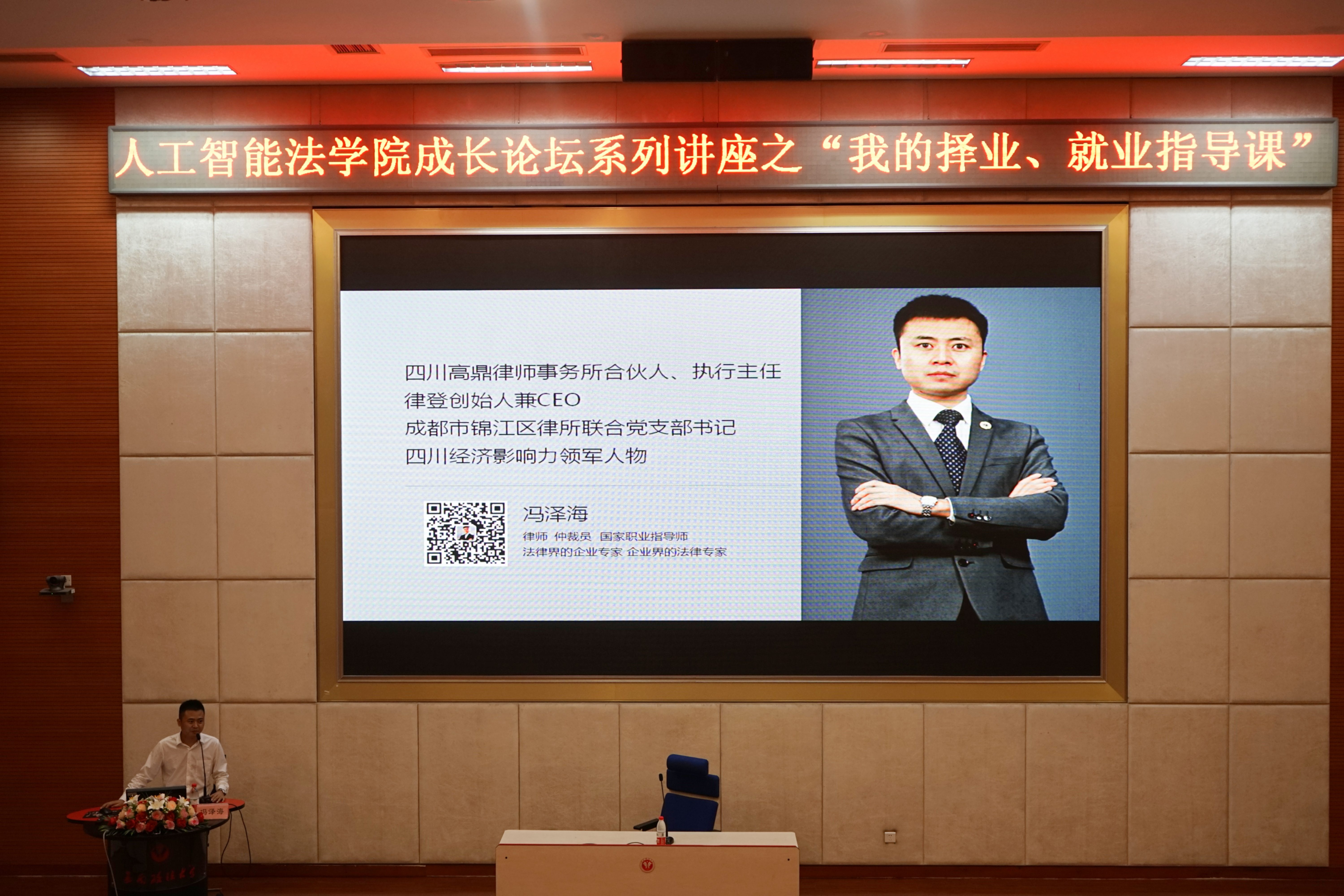 6月20日下午,应学院邀请,四川高鼎律师事务所合伙人、执行主任,律登创始人兼CEO、成都市锦江区律所联合党支部书记、四川经济影响力领军人物、03级优秀毕业生冯泽海,于毓才楼三楼学术报告厅作了主题为“未来已来,后会无期”的讲座。本次讲座由学院15级辅导员谭瑞和主持。