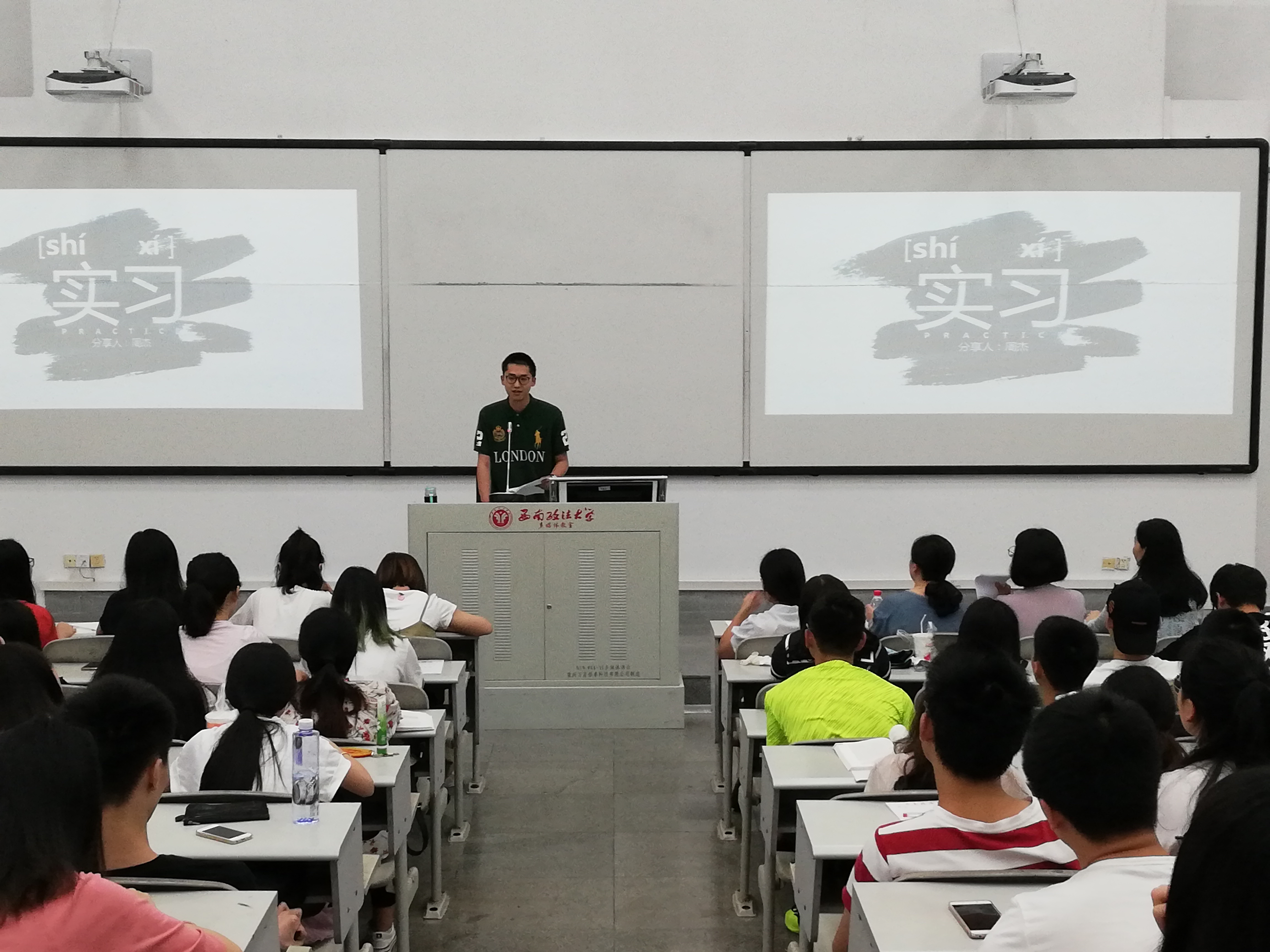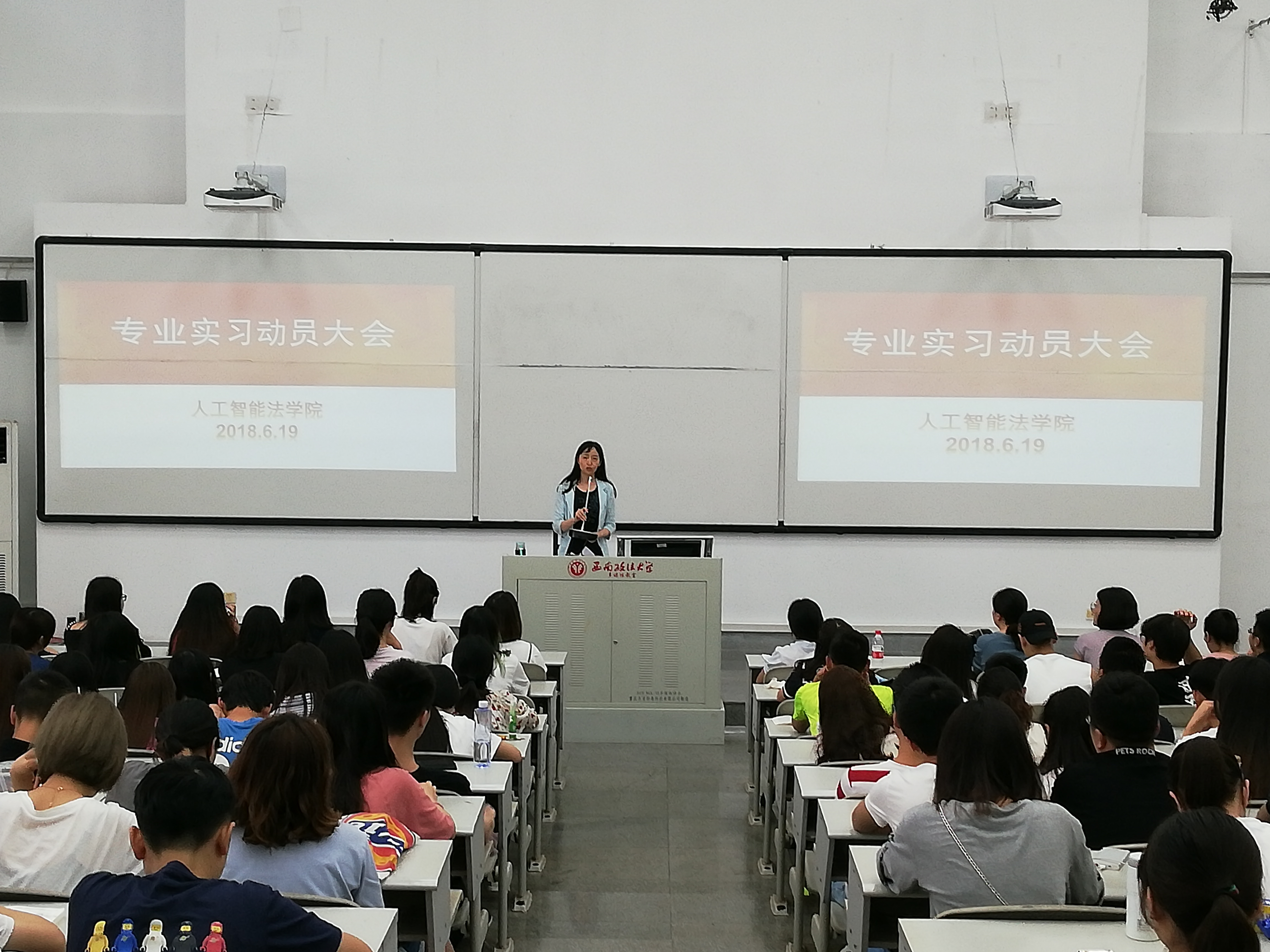 6月19日上午,人工智能法学院法学本科2016级、2016级实验班同学在博学楼4324召开了2018年实习动员大会。此次大会由年级辅导员黄薇老师主持,学院党委书记胡晓春、副院长铁燕、教务办主任冯成辰到场参加了此次动员大会,大会还邀请了学院 2015级优秀实习生周杰同学分享了其去年的实习经验。