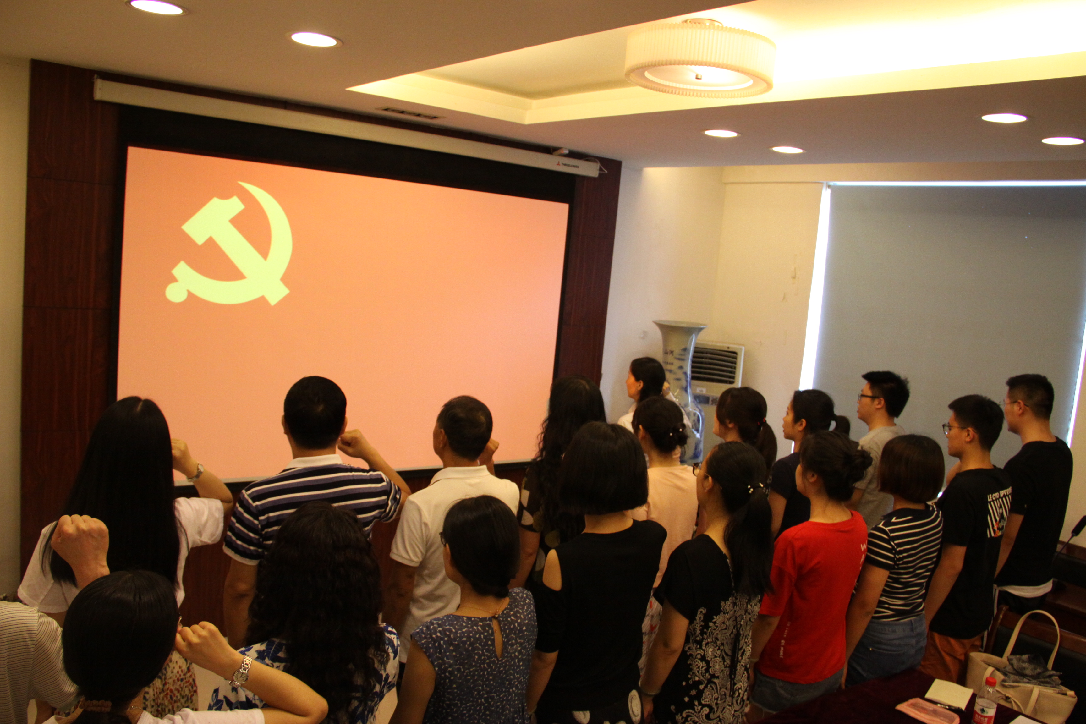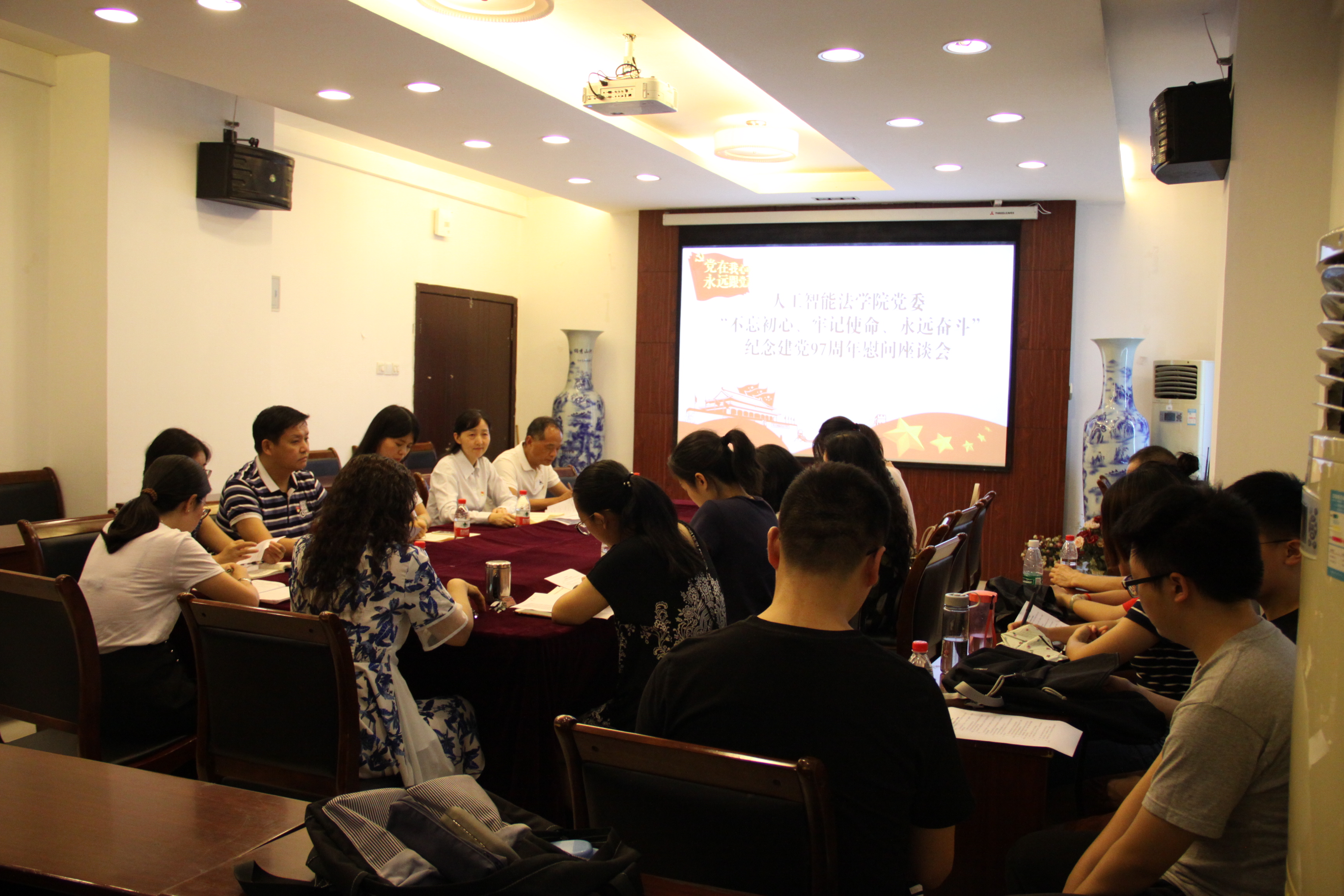 2018年6月27日下午,敬业楼2025会议室,人工智能法学院党委组织召开“不忘初心、牢记使命、永远奋斗”纪念建党97周年座谈会,会议由学院党委书记胡晓春主持。学院党委委员、各党支部支部书记、教师党员代表、学生党员代表和党外人士代表参加了此次座谈会。