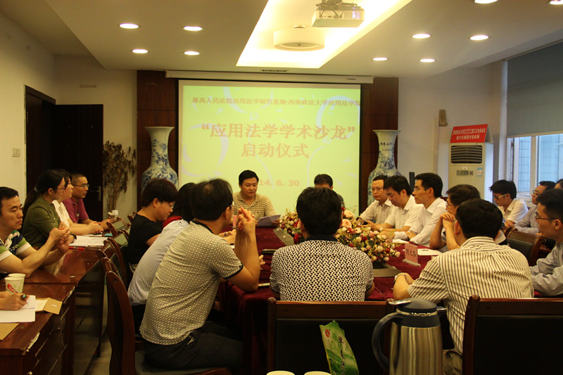 6月30日下午,由最高人民法院应用法学研究基地·365bet亚洲版承办的“应用法学学术沙龙”启动仪式暨首期沙龙在我校敬业楼2001会议室举行,甘肃省渭源县挂职副县长张群、重庆市法制办副主任张勇、重庆市法制办文审处处长展光华、西南政法大学科研处处长徐泉、重庆市第一中级人民法院行政庭庭长刘之伟、成都思勉律师事务所主任郭军、应用法学院院长杨建学和部分教师、学生参加了此次启动仪式暨首期沙龙。此次仪式由应用法学院院长杨建学主持。