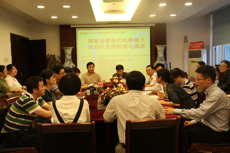 启动仪式后,甘肃省渭源县挂职副县长张群、重庆市法制办副主任张勇以“国家治理现代化视域下法治区县的机遇与挑战”为主题的首期“应用法学学术沙龙”开讲,重庆市法制办副主任张勇、重庆市法制办文审处处长展光华、西南政法大学科研处处长徐泉、重庆市第一中级人民法院行政庭庭长刘之伟、成都思勉律师事务所主任郭军、参与与谈。