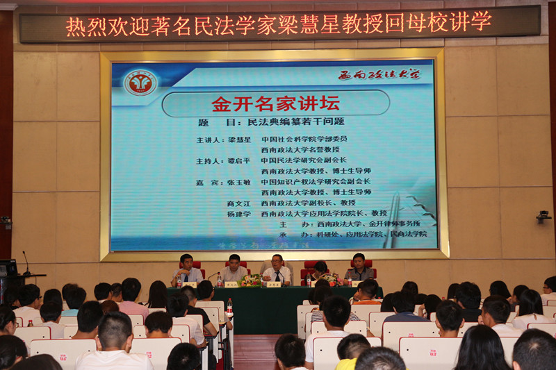 6月22日晚,由西南政法大学、金开律师事务所主办,西南政法大学科研处、应用法学院、民商法学院承办的金开名家讲坛在毓才楼一楼学术报告厅顺利举行。我校62级校友、著名民法学家、中国社会科学院学部委员梁慧星教授回到母校,紧扣“十八届四中全会之编纂民法典”这一主题,作了题为“民法典编纂的若干问题”的精彩讲座。讲座由中国民法学研究会副会长、民商法学院谭启平教授主持。中国知识产权法学研究会副会长、民商法学院张玉敏教授,西南政法大学副校长商文江教授,365bet亚洲版院长杨建学教授作为点评嘉宾莅临本场讲座。