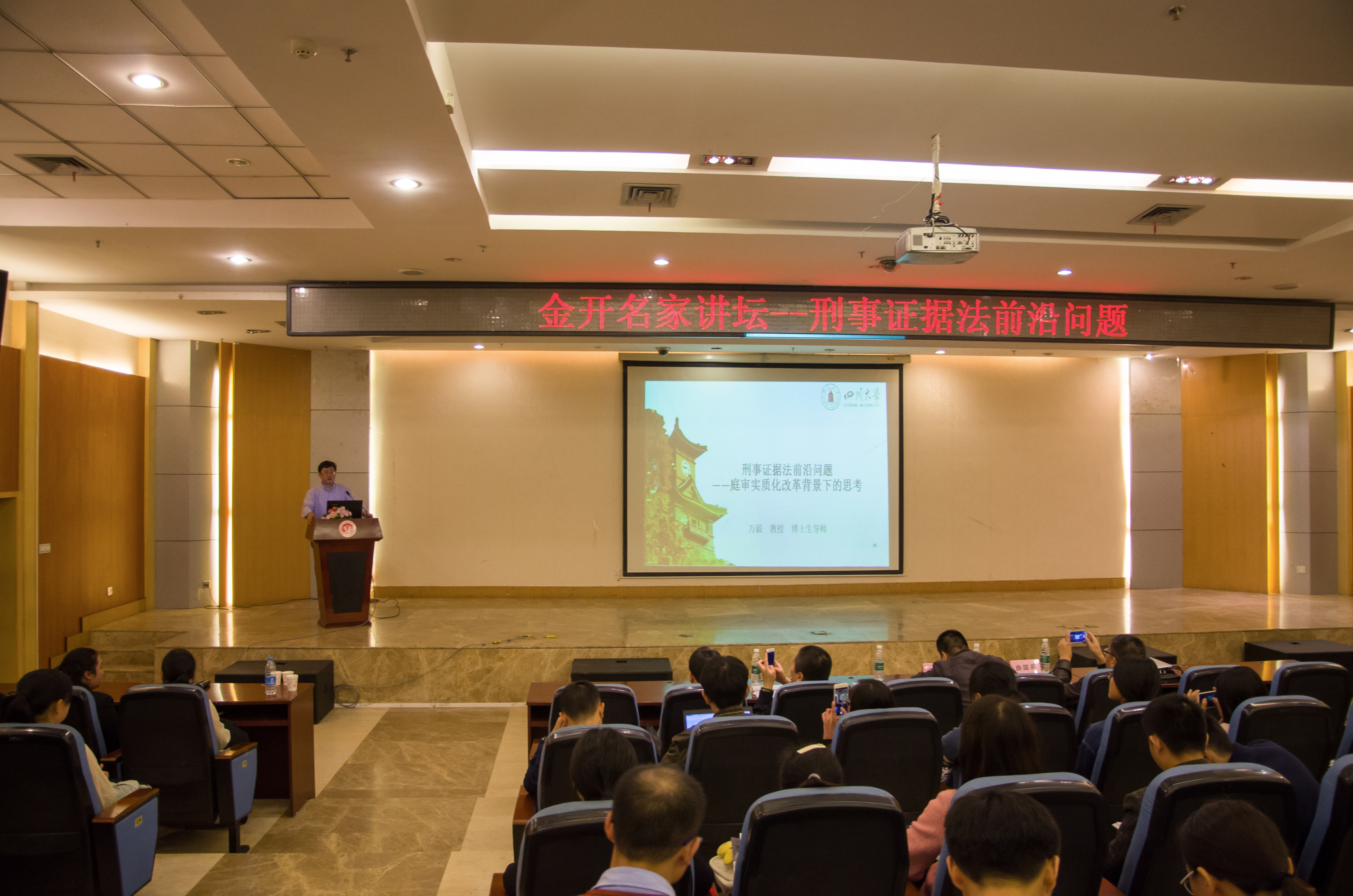 11月4日晚7点,应用法学院在图书馆学术报告厅举办了以刑事证据法前沿问题为主题的讲座。此次讲座由四川大学法学院教授、博士生导师万毅主讲;由应用法学院副院长陈亮教授主持,并有幸邀请到西南政法大学刑事侦查学院教授、法学博士艾明,西南政法大学教授、硕士研究生导师房国宾和西南政法大学民商法学院教授曹伟三位资深教授作为此次讲座的点评嘉宾。万毅教授毕业于西南政法大学,现任四川大学法学教授、博士生导师,是刑事证据法研究领域的杰出人物之一。